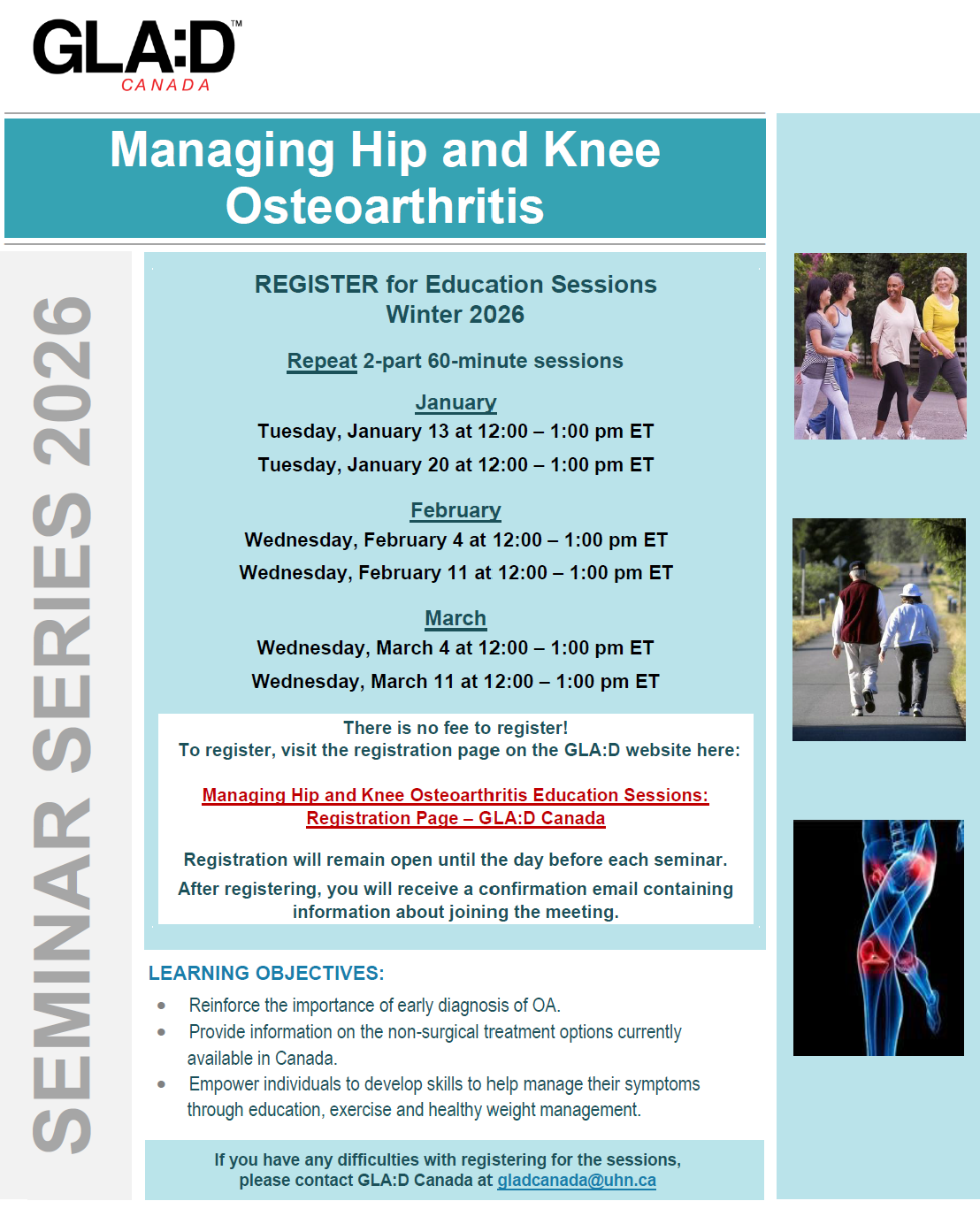 These education sessions are for people who would like more information about hip and knee osteoarthritis. Registration is for the repeat 2-part sessions that are 60-min long and are hosted virtually using Zoom. Time is provided at the end to answer questions.